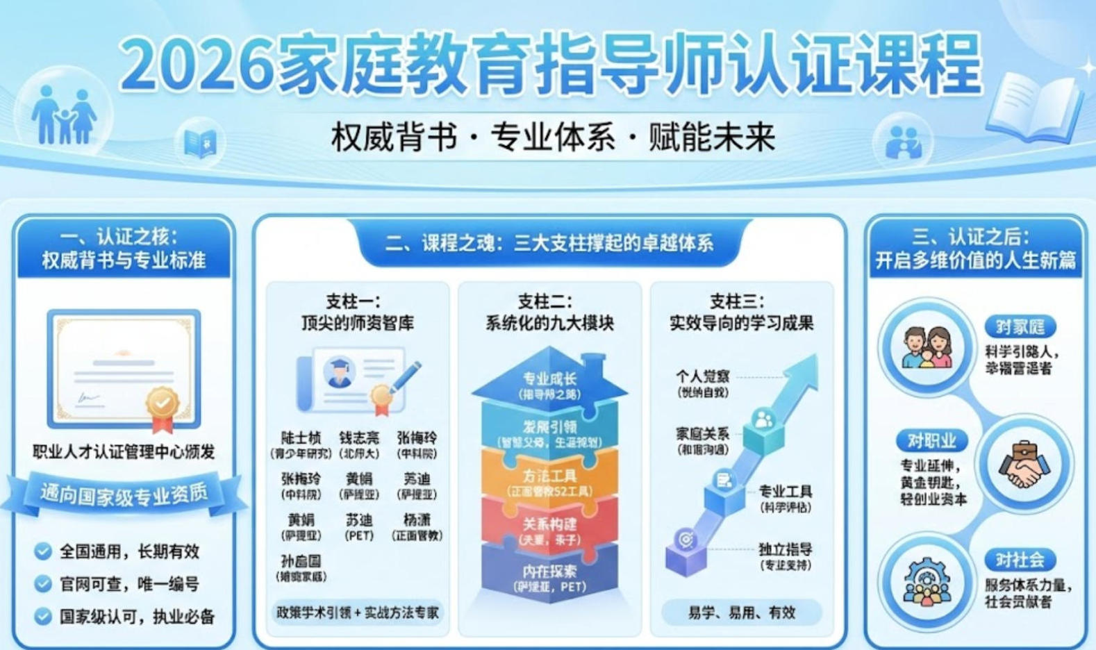 当“家长是孩子的第一任老师”从一句箴言变为一项需要专业支撑的实践,一个权威的认证课程便成为连接爱与智慧的关键桥梁。2026年,由职业人才认证管理中心发起的家庭教育指导师认证课程,正是这样一座桥梁。它不仅是一系列培训,更是一套完整的专业赋能体系,旨在将您塑造为兼具理论深度与实践智慧的家庭教育领航者。