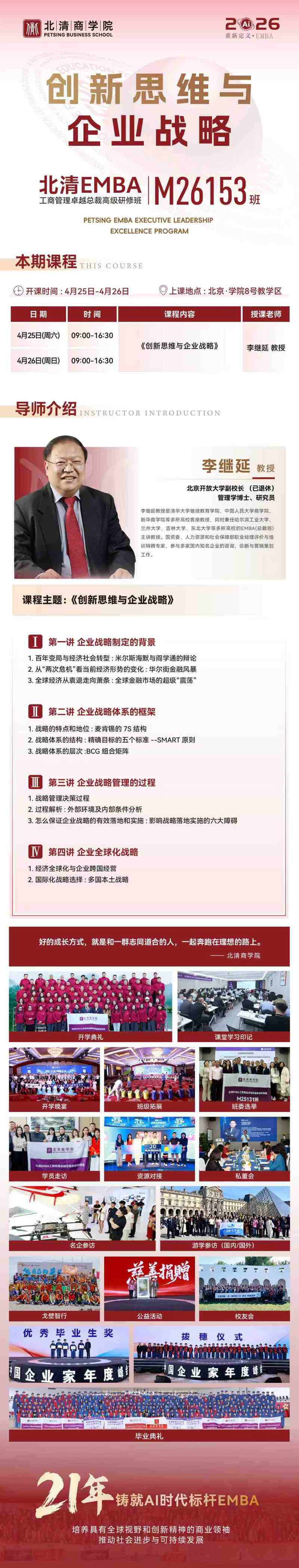 各位学员,北清EMBA M26153班课程通知发布。本次课程特邀李继延教授主讲,主题为《创新思维与企业战略》,上课时间为4月25日-26日,上课地点为北京·学院8号教学楼。请各位学员提前安排好时间,准时参加。
