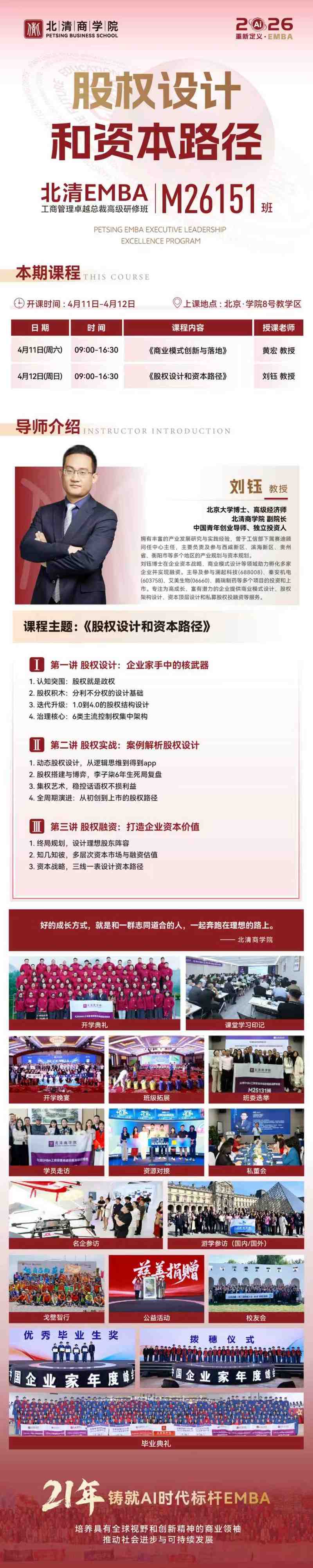 北清EMBA M26151班《股权设计和资本路径》课程通知(刘钰老师,4月11日-12日)