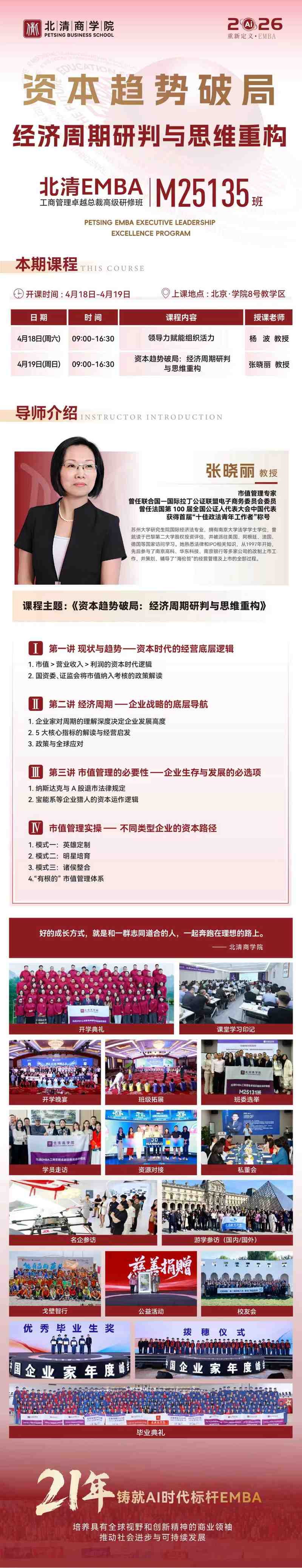 各位学员,北清EMBA M25135班课程通知发布。本次课程特邀张晓丽教授主讲,主题为《资本趋势破局:经济周期研判与思维重构》,上课时间为4月18日-19日,上课地点为北京·学院8号教学楼。请各位学员提前安排好时间,准时参加。